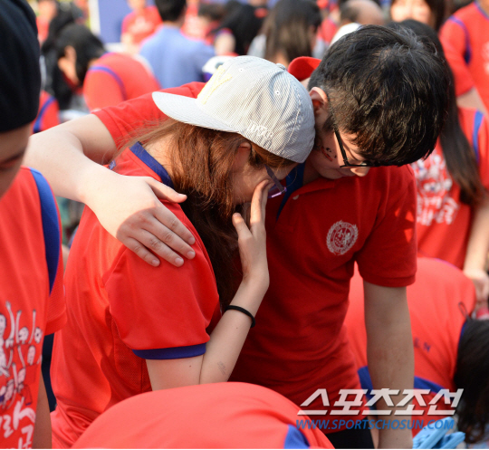 2014 브라질월드컵 조별리그 3차전 벨기에와의 경기를 앞둔 27일 새벽 서울 코엑스 앞 영동대로에서 길거리 응원전이 펼쳐졌다. 한국이 1대0으로 패하며 16강 진출이 좌절되자 이를 지켜보던 팬들이 아쉬워하고 있다.