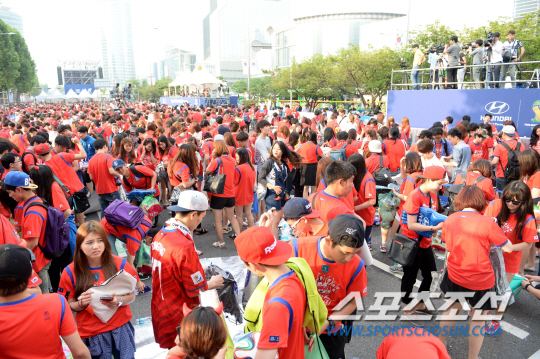 2014 브라질월드컵 조별리그 3차전 벨기에와의 경기를 앞둔 27일 새벽 서울 코엑스 앞 영동대로에서 길거리 응원전이 펼쳐졌다. 1대0으로 패하며 16강 진출이 좌절되자 경기를 지켜보던 시민들이 자리에서 일어서며 쓰레기를 정리하고 있다.
