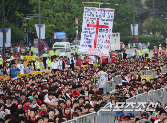 2014 브라질월드컵 조별리그 3차전 벨기에와의 경기를 앞둔 27일 새벽 서울 세종로 광화문광장에서 길거리 응원이 펼쳐졌다. 한국팀이 0대1로 패하며 1무2패, 조 최하위로 16강 진출이 좌절됐다. 응원하는 시민들 사이로 종교적인 플래카드를 든 남성이 지나가고 있다.