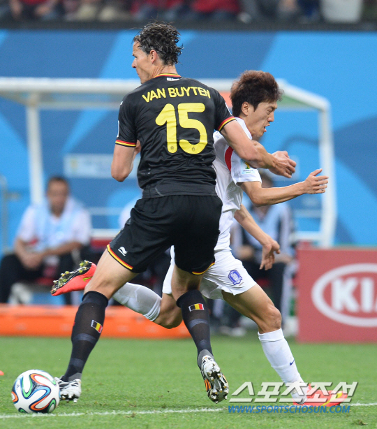 2014브라질월드컵 H조 3차전 한국과 벨기에의 경기가 27일 (한국시간) 상파울루의 아레나 코린치안스경기장에서 열렸다. 한국의 이청용과 벨기에의 반 바이텐이 치열한 볼경합을 벌이고 있다.