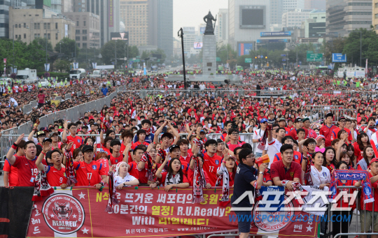 2014 브라질월드컵 조별리그 3차전 벨기에와의 경기를 앞둔 27일 새벽 서울 세종로 광화문광장에서 길거리 응원이 펼쳐졌다. 한국팀이 0대1로 패하며 1무2패, 조 최하위로 16강 진출이 좌절됐다. 붉은 악마들이 마지막까지 응원을 하고 있다.
