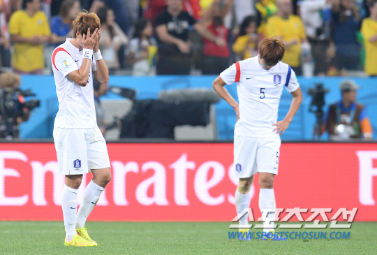 2014브라질월드컵 H조 3차전 한국과 벨기에의 경기가 27일 (한국시간) 상파울루의 아레나 코린치안스경기장에서 열렸다. 한국의 기성용이 벨기에 베르통언에게 결승골을 허용한후 얼굴을 감싸쥐고 있다.