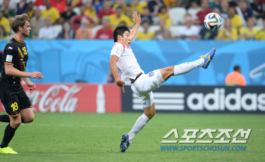 2014브라질월드컵 H조 3차전 한국과 벨기에의 경기가 27일 (한국시간) 상파울루의 아레나 코린치안스경기장에서 열렸다. 한국 이근호가 발리슛을 시도했으나 빗나가고 있다.