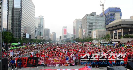 2014 브라질월드컵 조별리그 3차전 벨기에와의 경기를 앞둔 27일 새벽 서울 세종로 광화문광장에서 길거리 응원이 펼쳐졌다. 한국팀이 0대1로 패하며 1무2패, 조 최하위로 16강 진출이 좌절됐다. 마지막까지 응원을 펼치고 있는 시민들의 모습.