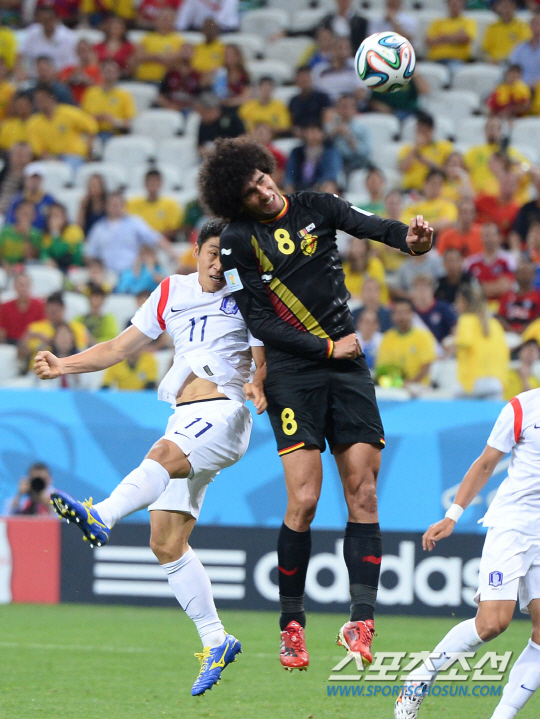 2014브라질월드컵 H조 3차전 한국과 벨기에의 경기가 27일 (한국시간) 상파울루의 아레나 코린치안스경기장에서 열렸다. 한국의 이근호와 벨기에의 펠라이니가 치열한 볼경합을 벌이고 있다.