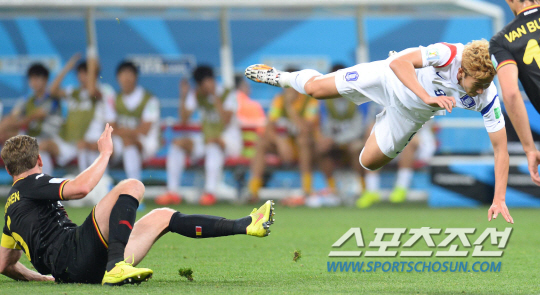 [월드컵포토] 손흥민 '공중부양까지 해야해?'(한국:벨기에)