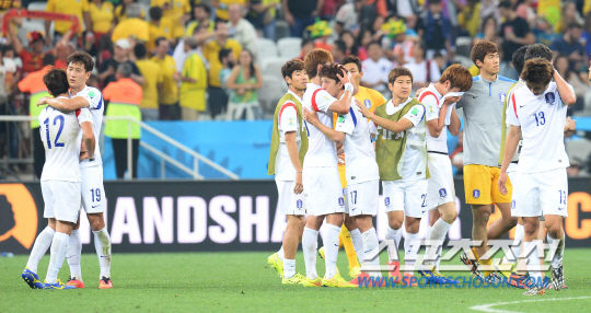 2014브라질월드컵 H조 3차전 한국과 벨기에의 경기가 27일 (한국시간) 상파울루의 아레나 코린치안스경기장에서 열렸다. 태극전사들이 벨기에에 0대1로 패한후 경기장을 걸어나오고 있다.
