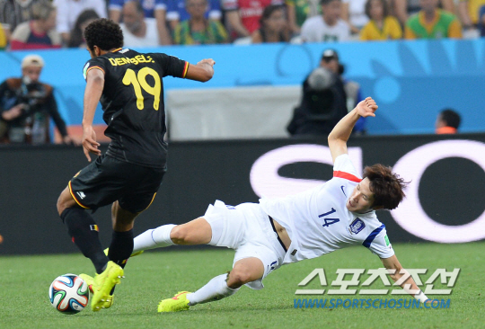 2014브라질월드컵 H조 3차전 한국과 벨기에의 경기가 27일 (한국시간) 상파울루의 아레나 코린치안스경기장에서 열렸다. 한국의 한국영이 벨기에 뎀벨르와 치열한 볼경합을 벌이고 있다. 상파울루(브라질)=최문영 기자 deer@sportschosun.com