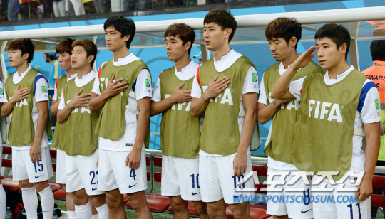 2014브라질월드컵 H조 3차전 한국과 벨기에의 경기가 27일 (한국시간) 상파울루의 아레나 코린치안스경기장에서 열렸다. 한국의 박주영에 벤치에서 국기에 대한 경례를 하고 있다.