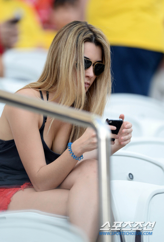 2014브라질월드컵 H조 3차전 한국과 벨기에의 경기가 27일 (한국시간) 상파울루의 아레나 코린치안스경기장에서 열렸다. 한 브라질 여성팬이 아찔한 탱크탑 의상을 입고 경기를 관전하고 있다.