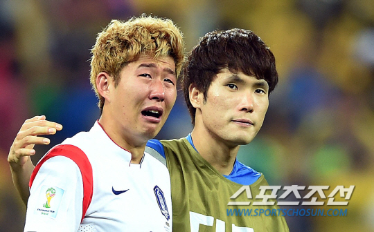 2014브라질월드컵 H조 3차전 한국과 벨기에의 경기가 27일 (한국시간) 상파울루의 아레나 코린치안스경기장에서 열렸다. 0대1로 벨기에에 패해 16강 진출이 좌절된 홍명보호의 손흥민이 경기종료후 울음을 터뜨리고 있다.