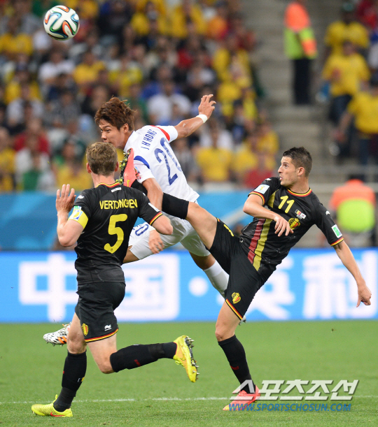 2014브라질월드컵 H조 3차전 한국과 벨기에의 경기가 27일 (한국시간) 상파울루의 아레나 코린치안스경기장에서 열렸다. 한국의 홍정호와 벨기에의 베르통언이 치열한 볼경합을 벌이고 있다. 상파울루(브라질)=최문영 기자 deer@sportschosun.com