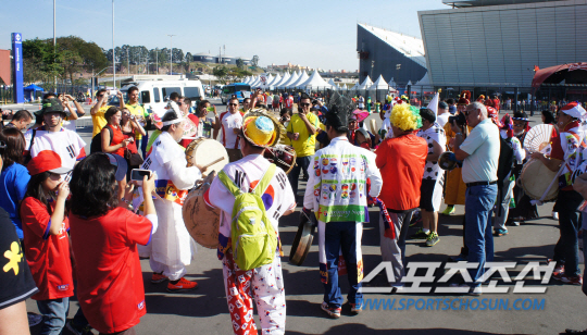 한국에서 날아온 축구팬들과 상파울루 등 교민이 가세해 4000여명의 대형 응원단을 조직한 붉은 악마는 경기가 열리기 2시간 전부터 상파울루 아레나 코린치안스 경기장 주변에서 붉은 응원을 주도했다. 북과 꽹과리, 장구 등을 이용한 사물놀이 가락이 흘러나오자 '대~한민국'이 경기장 주변을 가득 메웠다.