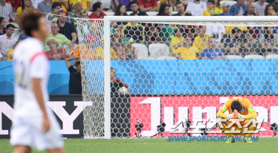 2014브라질월드컵 H조 3차전 한국과 벨기에의 경기가 27일 (한국시간) 상파울루의 아레나 코린치안스경기장에서 열렸다. 한국의 골키퍼 김승규가 벨기에 패색이 짙어진 경기를 지켜보고 있다. 상파울루(브라질)=최문영 기자 deer@sportschosun.com /2014.06.27/