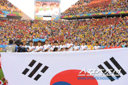 2014브라질월드컵 H조 3차전 한국과 벨기에의 경기가 27일 (한국시간) 상파울루의 아레나 코린치안스경기장에서 열렸다. 경기전 태극전사들이 태극기를 향해 국민의례를 하고 있다. 상파울루(브라질)=최문영 기자 deer@sportschosun.com /2014.06.27/