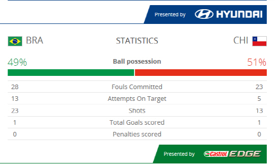 이날 '디펜딩 챔피언'스페인을 밀어낸 칠레의 파이팅은 눈부셨다. 네이마르 헐크를 앞세운 브라질의 파상공세, 23개의 슈팅, 13개의 유효슈팅을 단 1골로 묶었다. 점유율에선 49대51로우위를 점했다. 후반전과 연장전 체력과 투혼에서 오히려 우위를 점했다. 전반전 빛의 속도로 내달렸던 네이마르가 후반 중반 이후 급격히 활동량이 줄었던 데 비해, 산체스, 아랑기스 등 칠레 공격수들은 지칠 줄 모르고 달렸다. 연장 후반 종료직전, 마지막 순간 피냐르의 슈팅에 골대 불운이 없었더라면 새역사가 가능했던, 대단한 승부였다.