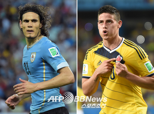 ◇수아레스가 없는 우루과이의 카바니는 전반 침묵했고, 콜롬비아의 로드리게스는 4경기 연속골을 터트렸다. 콜롭비아가 전반을 1-0으로 리드하고 있다. ⓒAFPBBNews = News1