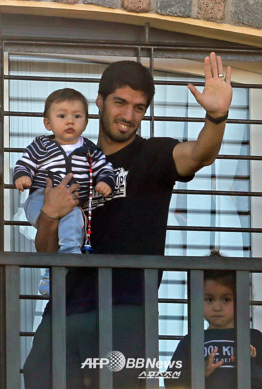 | ◇고국으로 돌아온 우루과이의 수아레스가 지지하는 팬들을 향해 인사하고 있다. 라고마르(우루과이)=ⓒAFPBBNews = News1 |