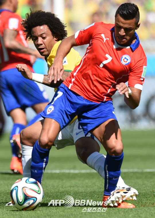 | 칠레의 산체스(오른쪽)가 브라질의 마르셀루와 공을 다투고 있다. ⓒAFPBBNews = News1 |