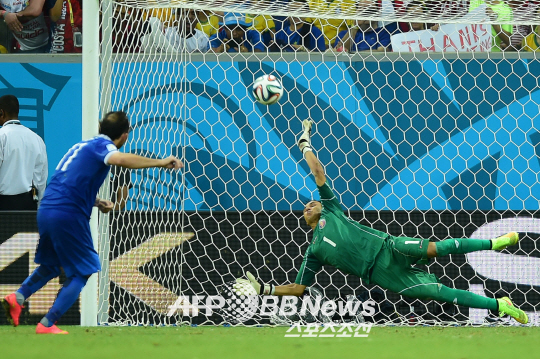 | 그리스의 4번째 키커 게카스의 슛을 나바스가 몸을 날려 막아내고 있다. |