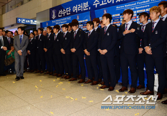 이날 인천국제공항을 통해 귀국한 대표팀에게는 "엿 먹어라!"라며 호박엿 사탕이 날아오는가 하면, 눈앞에 '근조, 한국 축구는 죽었다'라는 플래카드가 걸리기도 했다. 이날 기자회견에서 홍명보 감독은 "국민 여러분의 성원에 보답하지 못해 죄송하다"라면서 "선수들에게는 미래가 있다. 이번 월드컵이 남는 것이 있는 대회가 될 수 있도록 소속팀에서 더 노력했으면 좋겠다"라는 소감을 밝혔다. 또 자신의 거취 문제에 대해서는 "지금 얘기하기가 좀 그렇다. 어려운 결정"이라며 대답을 피했다.