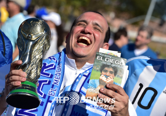브라질 상파울루의 코린치안스 아레나에서 열린 2014 브라질 월드컵 16강전 스위스와의 경기에 나서는 아르헨티나의 한 팬이 월드컵 모조 트로피와 마라도나의 사진을 들고 포즈를 취하고 있다. 아르헨티나는 120분간의 연장 혈투 끝에 디마리아의 결승골로 스위스를 1대0으로 물리치고 8강에 진출 했다.