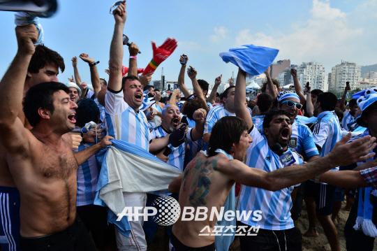 아르헨티나 리우데자네이로의 코파카바나 해변에 모인 축구 팬들이 스위스와의 16강전에 나서는 자국팀을 열열히 응원하고 있다. 아르헨티나는 120분간의 연장 혈투 끝에 디마리아의 결승골로 스위스를 1대0으로 물리치고 8강에 진출 했다.