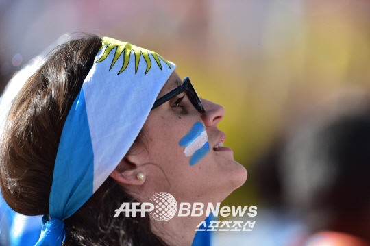 브라질 상파울루의 코린치안스 아레나에서 2014 브라질 월드컵 16강전 아르헨티나와 스위스의 경기가 펼쳐 졌다. 경기장을 찾은 아르헨티나 여성팬이 자국팀을 응원하고 있다. 아르헨티나는 120분간의 연장 혈투 끝에 디마리아의 결승골로 스위스를 1대0으로 물리치고 8강에 진출 했다.