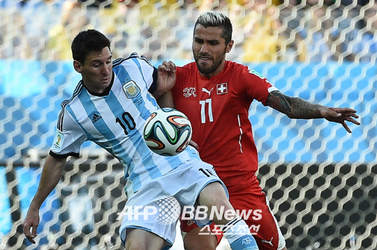 브라질 상파울루의 코린치안스 아레나에서 2014 브라질 월드컵 16강전 아르헨티나와 스위스의 경기가 펼쳐 졌다. 아르헨티나 리오넬 메시가 스위스 발론 베라미와 볼을 다투고 있다. 아르헨티나는 120분간의 연장 혈투 끝에 디마리아의 결승골로 스위스를 1대0으로 물리치고 8강에 진출 했다.