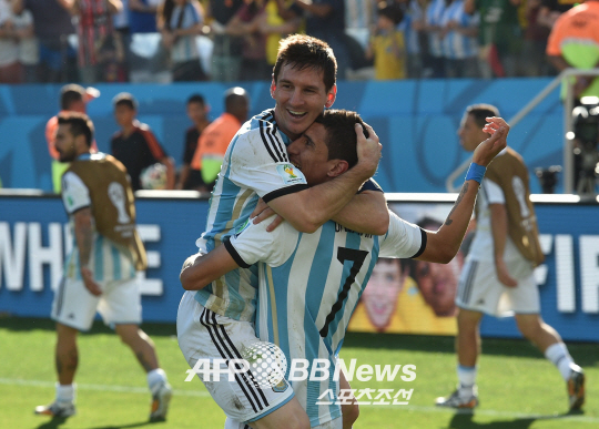 브라질 상파울루의 코린치안스 아레나에서 2014 브라질 월드컵 16강전 아르헨티나와 스위스의 경기가 펼쳐 졌다. 아르헨티나 리오넬 메시가 골을 터뜨린 디마리아와 포옹을 하며 좋아하고 있다. 아르헨티나는 120분간의 연장 혈투 끝에 디마리아의 결승골로 스위스를 1대0으로 물리치고 8강에 진출 했다.