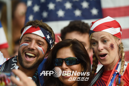 2014 월드컵 16강전 미국과 벨기에의 경기가 브라질 살바도르의 폰테 노바 아레나에서 펼쳐 졌다. 얼굴에 페인팅을 한 미국 팬들이 자국팀을 열열히 응원하고 있다. 벨기에는 연장 접전 끝에 미국을 2대1로 누르고 8강에 진출 했다.