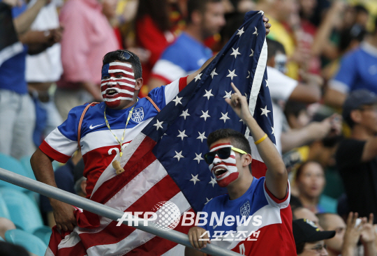 2014 월드컵 16강전 미국과 벨기에의 경기가 브라질 살바도르의 폰테 노바 아레나에서 펼쳐 졌다. 얼굴에 페인팅을 한 미국 팬들이 자국팀을 열열히 응원하고 있다. 벨기에는 연장 접전 끝에 미국을 2대1로 누르고 8강에 진출 했다.