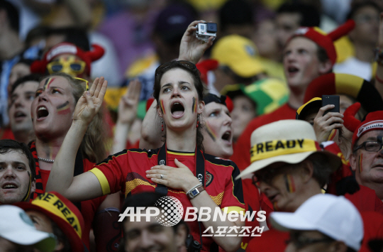 2014 월드컵 16강전 미국과 벨기에의 경기가 브라질 살바도르의 폰테 노바 아레나에서 펼쳐 졌다. 얼굴에 페인팅을 한 벨기에 팬들이 자국팀을 열열히 응원하고 있다. 벨기에는 연장 접전 끝에 미국을 2대1로 누르고 8강에 진출 했다.