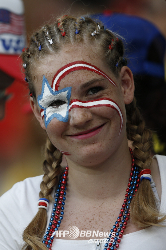 2014 월드컵 16강전 미국과 벨기에의 경기가 브라질 살바도르의 폰테 노바 아레나에서 펼쳐 졌다. 얼굴에 페인팅을 한 미국 팬이 자국팀을 열열히 응원하고 있다. 벨기에는 연장 접전 끝에 미국을 2대1로 누르고 8강에 진출 했다.