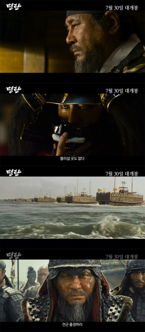 이처럼 불가능한 전쟁에서 절대 포기하지 않고 끝까지 왜군에게 맞서는 이순신 장군의 모습으로 드라마틱한 감동과 묵직한 울림을 전하는 것은 물론 전에 없던 압도적인 볼거리로 숨 막히는 긴박감과 짜릿한 쾌감을 전하는 메인 예고편은 '명량'에 대한 기대를 뜨겁게 고조시키고 있다.