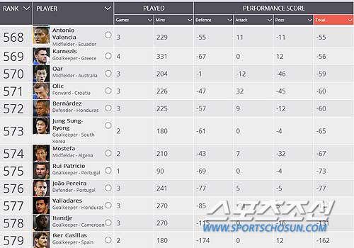 전체 579명 중 573위는 정성룡, 최하위인 579위는 카시야스다. ⓒsquawka
