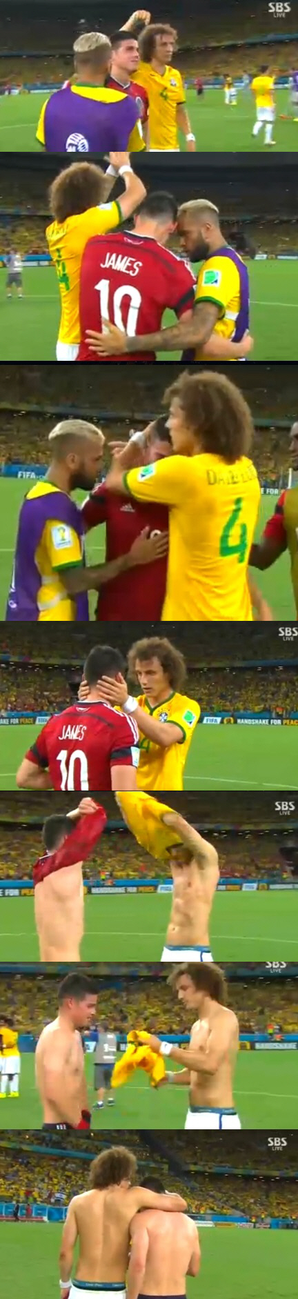 경기후 매너에서도 MOM이었다. 무릎을 꿇고 하늘을 두손으로 가리키며 열정적인 감사기도를 올린 루이스는 눈물을 펑펑 흘리고 있는 콜롬비아 에이스 하메스 로드리게스를 돌아봤다. 5골로 득점선두를 달리며 콜롬비아 돌풍을 이끌었던 로드리게스는 이날 페널티킥으로 5경기 연속골, 브라질월드컵 6호골을 쏘아올렸다. 8강에서 멈춰서며 골기록도 6골에서 멈춰섰지만 이번 대회 최고의 선수임은 분명했다. 진한 아쉬움의 눈물을 흘리고 있는 로드리게스에게 루이스가 다가왔다. 루이스를 손끝으로 가리킨 후 관중들에게 박수를 유도했다. '우리가 승리했지만 이 선수 역시 박수 받아 마땅하다'는 메시지를 전했다. 서로를 포옹한 후 유니폼을 교환했다. 서로의 유니폼을 손에 쥔 채 어깨동무를 하고 그라운드를 빠져나갔다. 강렬한 무회전 프리킥만큼 인상적인 장면이었다. 스포츠2팀