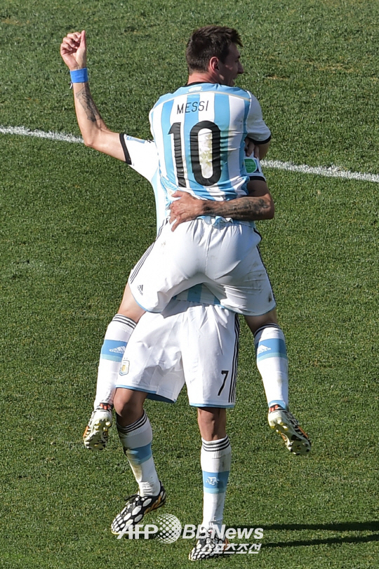 ◇결승골을 터트린 디 마리아가 결정적인 어시스트를 한 메시를 안고 환호하고 있다. 상파울루(브라질)=ⓒAFPBBNews = News1