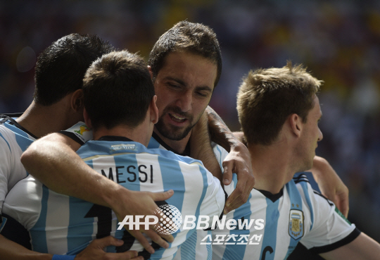 ◇아르헨티나가 24년 만에 4강에 진출했다. 이과인이 전반 8분 결승골을 터트린 후 동료들과 함께 기뻐하고 있다. 브라질리아= ⓒAFPBBNews = News1