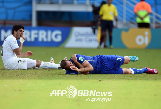 수아레스에게 어깨를 물린 키엘리니(오른쪽)가 그라운드에 쓰러져 있다. ⓒAFPBBNews = News1