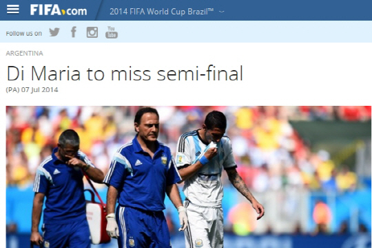 팀 공격을 책임지는 에이스드이 잇달아 부상했다. 9일 새벽 5시 독일과 4강전을 치르는 브라질은 척추골절 부상으로 치료중인 네이마르 대신 윌리안이 나설 전망이다. 네덜란드와 4강전을 앞둔 아르헨티나는 축구협회를 통해 8강전 벨기에전(1대0 승)에서 허벅지 근육을 다친 앙헬 디 마리아가 4강전에 결장한다고 발표했다. 16강전에서 스위스를 상대로 인저리타임 결승골을 넣었던 디마리아의 부재는 아르헨티나 대표팀에게 악재다. 브라질월드컵에서 조별예선에서 부상하며, 유독 부진했던 공격수 세르히오 아구에로가 끈질긴 재활로 다시 기회를 잡았다. 부상 후유증을 털고 디 마리아의 공백을 메우게 될 것으로 보인다.