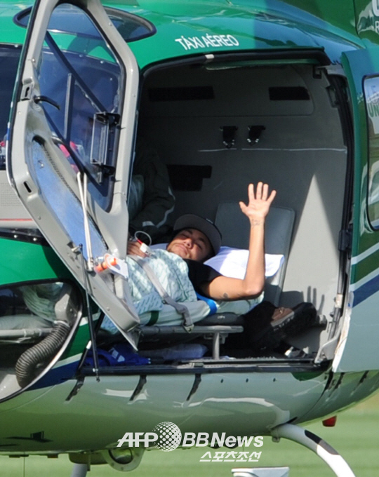 | 네이마르가 헬리콥터로 이송되기 전 손을 흔들어 보이고 있다. ⓒAFPBBNews = News1 |