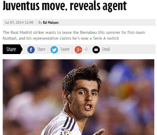 8일(한국시각) 스페인 스포츠전문지 아스는 모라타 에이전트의 말을 빌어 모라카가 유벤투스 이적이 임박했다고 보도했다. 모라타는 레알 마드리드의 미래로 불렸지만 지난시즌 부진으로 팀에서 설자리를 잃었다. 아스널과 유벤투스가 모라타를 노렸다. 유벤투스는 이적료 1200만파운드를 제시했고, 레알 마드리드의 마음을 돌렸다. 레알 마드리드는 여전히 임대 이적을 원하지만 모라타는 완전 이적을 원하고 있다. 이 부분에 대한 것만 정리되면 협상이 마무리될 것으로 보인다.