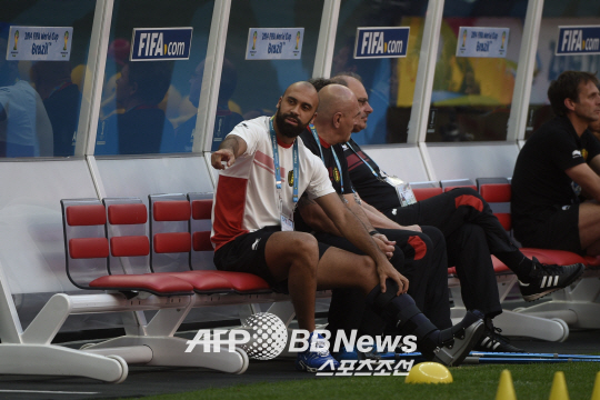아르헨티나와의 8강전을 벤치에서 지켜보고 있는 반덴 보레. 발 옆에 목발이 보인다. ⓒAFPBBNews = News1