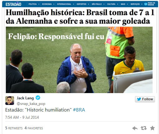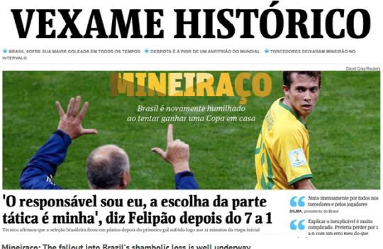 또 다른 언론인 '에스타다오'는 '역사상 최고의 수치'라는 제하의 기사에서 '축국국가로써 전세계에 알려진 나라 중 모든 것을 통틀어 치욕스러운 패배'라고 전했다. 또 '역사적인 참패'라며 책임있는 루이스 펠리프 스콜라리 감독의 자세를 요구했다.