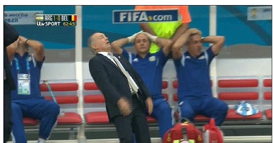 첫 손에 꼽힌 장면은 알레한드로 사베야 아르헨티나 감독의 '졸도'였다. 사베야 감독은 5일 벨기에와의 8강전 도중 뒤로 크게 넘어질 뻔했다. 아르헨티나가 1-0으로 앞선 후반 10분경 곤살로 이과인의 중거리슛이 골대를 맞고 득점으로 연결되지 않자 사베야 감독은 마치 의식을 잃은 사람처럼 뒤로 곧장 넘어질 뻔하다가 스태프의 도움으로 힘겹게 중심을 되찾았다. 사베야 감독의 졸도 장면은 온라인을 후끈 달궜다. 게임 스트리트파이터를 비롯해 영화 매트릭스, 번지점프 등 다양한 패러디로 재현됐다.
