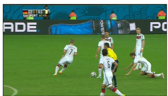 두 번째는 독일의 공격수 토마스 뮐러의 '꽈당 프리킥'이 선정됐다. 뮐러는 알제리와의 16강 경기 도중 프리킥 상황에서 상대 수비를 속이려다 그만 중심을 잃었다. 공격진도 수비진도 초집중하던 상황에서 펼쳐진 난감한 돌발상황, 뮐러는 땅을 짚은 채 앞으로 뛰어나가며 위기를 모면하려는 임기응변으로 대처했지만, 토니 크로스가 쇄도하는 뮐러를 향해 올린 킥은 불발됐다. 이미 박자도 긴장감도 흐트러진 후였다. 뮐러 스스로도 겸연쩍은 듯 머리를 감싸고 돌아서며 허탈한 웃음을 지어보였다.