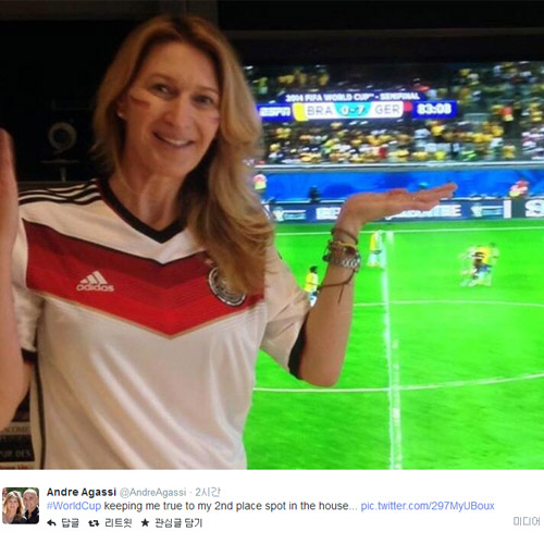 테니스 여제 슈테피 그라프와 유명 모델 하이디 클룸은 독일이 브라질에 7-0으로 앞서고 있는 TV 중계화면 앞에 서서 찍은 기념사진을 공개했다.