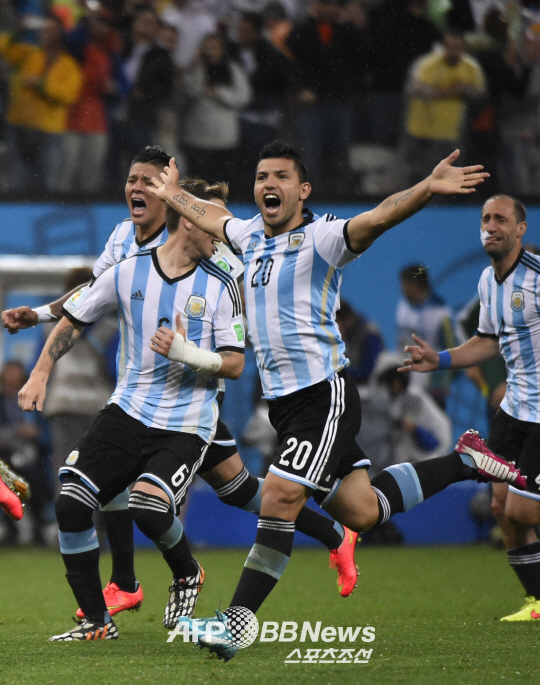 | 아구에로 등 아르헨티나 선수들이 브라질 월드컵 4강전 승부차기에서 네덜란드를 꺾고 결승 진출을 확정한 뒤 환호하고 있다. ⓒAFPBBNews = News1 |