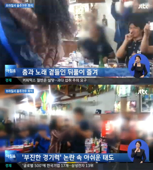 보도 영상에 따르면 홍명보 감독이 보는 가운데 선수들과 대표팀 스태프들이 흥겹게 여흥을 즐기며 한 명씩 나와 현지 가수로 보이는 여성과 춤을 추고 한쪽에선 그 모습을 스마트폰으로 촬영했다.